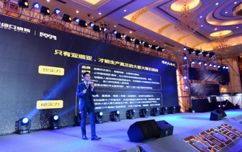 “告訴各位消費(fèi)者,大板大理石不等于有大理石花紋的瓷磚。”亞細(xì)亞集團(tuán)總裁盧偉佳表示大建材行業(yè)體量巨大、無龍頭壟斷、利潤空間大、未資本化、未互聯(lián)網(wǎng)化,很慶幸自己選擇了這個(gè)行業(yè),而且活著,未來三年亞細(xì)亞將實(shí)現(xiàn)50億銷售的規(guī)模。