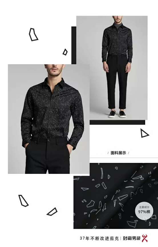 獨特的寫意幾何花型印花,由勁霸專屬花型設計師設計,致敬經典的同時流露新意。外搭圓領羊毛衫,儒雅范分分鐘爆棚。說了這么多,就是想告訴你,選這件,準沒錯。