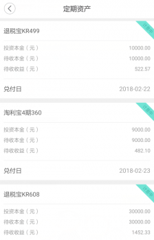 二看投資目標(biāo)。如果單純?yōu)榱速Y產(chǎn)的長(zhǎng)期增值,那么投資中可以適當(dāng)?shù)脑黾右恍╋L(fēng)險(xiǎn)資產(chǎn)的配置。如果目標(biāo)是長(zhǎng)期且剛需的,為了買(mǎi)房、孩子往后的教育費(fèi)、家人的醫(yī)療費(fèi)等等,那么投資就該以中低風(fēng)險(xiǎn)的投資為主,比如點(diǎn)點(diǎn)搜財(cái)?shù)睦碡?cái)產(chǎn)品安全穩(wěn)健,可根據(jù)不同的需求,分別投資相應(yīng)期限的產(chǎn)品。而且在點(diǎn)點(diǎn)搜財(cái)APP-我的-總資產(chǎn)-定期資產(chǎn),還能查看計(jì)息中和已兌付的收益,相當(dāng)于為用戶(hù)做好了投資記賬工作。