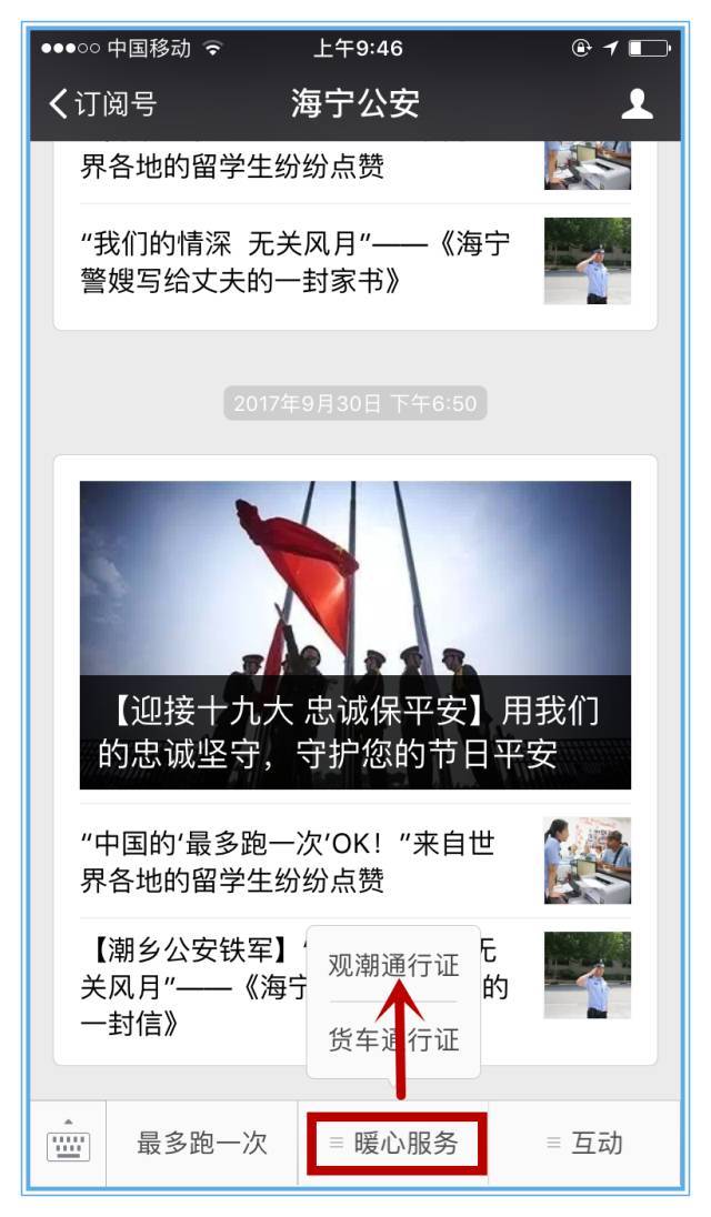 為方便來自全國各地的廣大游客觀潮,海寧公安交警結(jié)合“最多跑一次”改革推出觀潮車輛電子通行證,實(shí)現(xiàn)通行證辦理“零跑腿”,方便游客車輛快速進(jìn)入景區(qū)觀潮!觀潮節(jié)期間在“海寧公安”公眾微信號服務(wù)欄開通電子通行證申領(lǐng)入口。