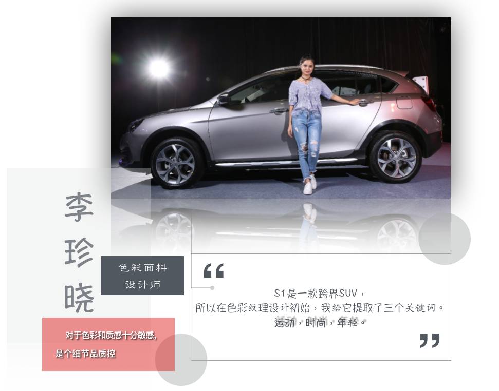 “\u00A0S1是一款跨界SUV,所以在色彩紋理設計初始,我給它提取了三個關鍵詞。運動,時尚,年輕。”李珍曉在演講開篇就如此表明S1的色彩立場。
