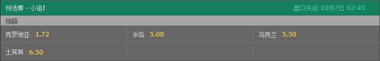 克羅地亞目前位列小組頭名,只有凈勝球的優勢,但是最終獲得這一名次的賠率僅為1.72,遙遙領先其他對手。冰島(5.00)、烏克蘭(5.50)和土耳其(6.50)倒是差不多。冰島與克羅地亞同分,今晚與土耳其(主)直接較量,最后一輪克羅地亞也將客場挑戰烏克蘭。