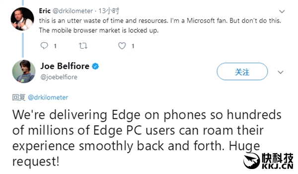 對此,微軟負責人喬北峰回應稱,Edge登陸手機是為了讓成百上千萬Edge PC用戶可以無縫漫游他們的體驗,對此群眾的呼聲是極高的!