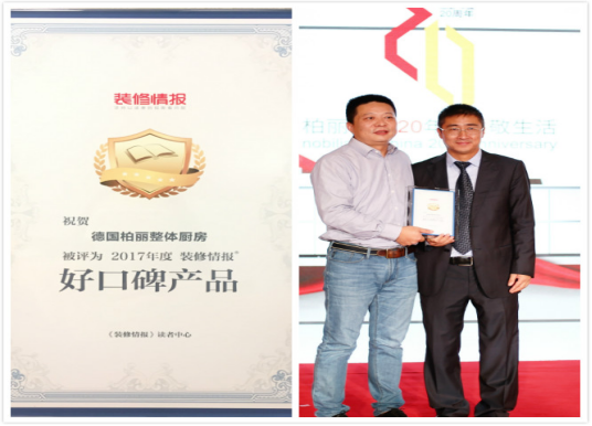 值得一提的是,《裝修情報(bào)》創(chuàng)始人陳志榮先生在現(xiàn)場(chǎng)也為德國(guó)柏麗頒發(fā)了2017年”好口碑產(chǎn)品“獎(jiǎng)牌,“好口碑產(chǎn)品”獎(jiǎng)項(xiàng)是由讀者真正使用后,推薦出來的好產(chǎn)品,好品牌。進(jìn)口櫥柜品牌中,讀者呼聲最高的是“德國(guó)柏麗整體廚房”。陳總將“好口碑產(chǎn)品”獎(jiǎng)項(xiàng)櫥柜行業(yè)的第一塊獎(jiǎng)牌頒發(fā)給了“德國(guó)柏麗”。