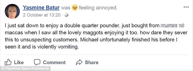 亞斯明將這一切拍了視頻,并上傳到“臉譜”網(wǎng)站上,并留言說(shuō)“我剛坐下享用這個(gè)雙層牛肉漢堡,我就看到了這群可愛(ài)的蛆也在享用。他們?cè)趺锤覍⑦@個(gè)拿給毫無(wú)防備的顧客。米歇爾不幸將這個(gè)全吃下,在我給他看了這個(gè)后猛烈地嘔吐起來(lái)。”