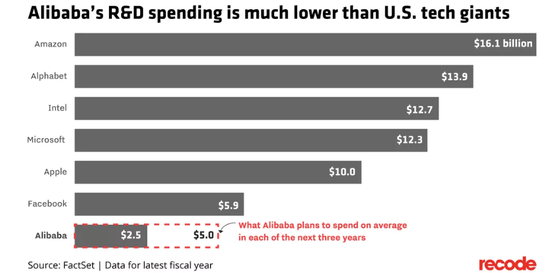 該文稱,在美國(guó),科技公司在研發(fā)投入上位于標(biāo)普500成分股公司的前列。阿里巴巴必須大幅增加其投資,才能趕上美國(guó)競(jìng)爭(zhēng)對(duì)手的水平。