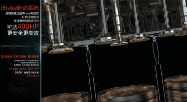 iBrake技術通過排氣搖臂與壓縮制動集成,工作時不向氣缸噴油,在壓縮沖程后期打開排氣門,消除了壓縮氣體能量的反彈,增加了發動機制動的效率,為整車提供370馬力的強大制動力,比排氣制動效率提升50%。