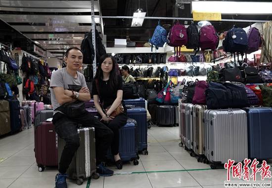 8月26日,北京市西二環(huán)外阜成門附近的萬通商城,做了十幾年箱包生意的王彩霞(右)夫妻在自家的箱包店前。8月31日,經(jīng)營了18年的全國首個五星級批發(fā)零售市場萬通商城正式閉市。