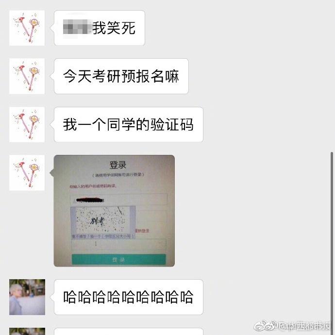 原來,9月24日,是國家研究生考試預(yù)報(bào)名首日,成都大學(xué)的一名女生在網(wǎng)上報(bào)名時(shí),竟出現(xiàn)了“別考”的驗(yàn)證碼字眼。