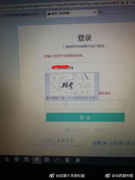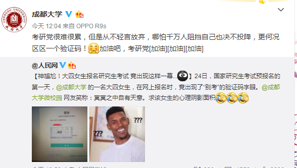 9月25日中午,成都大學(xué)官方微博回應(yīng)此事表示,“考研黨很難很累,但是從不輕言放棄,哪怕千萬人阻擋自己也決不投降,更何況區(qū)區(qū)一個(gè)驗(yàn)證碼!”