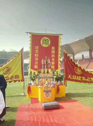 只見航海體育場大師云集,旗幡飄揚,上書:建業(yè)驍勇善戰(zhàn),旗開出奇制勝,兩側的旗幟上寫著:天意建業(yè)必勝。據河南人民廣播電臺“我是深藍”在微博透露,特邀北京真武廟住持李明清道長,真武廟監(jiān)院劉三慧坤道,北京慈航觀李高持乾道,山西省介休市后土廟高玄巖經主乾道,山西省太原市聚賢觀郭健經師乾道,陜西省華山玉泉院郭波乾道等十五位得道大師前來航海體育場為建業(yè)祈福。