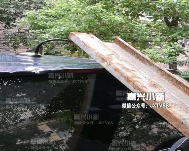張女士給我們打電話,說是9月27號上午,她去嘉興市區(qū)隆興公寓小區(qū)學畫畫,自己的奔馳車就停在樓下車位上。結果沒想到,倚靠在路邊樹枝上的兩塊鋼板,突然倒了下來,其中一塊正好砸在奔馳車的后備箱上,損失不小。