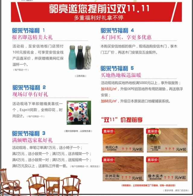 國(guó)內(nèi)高端實(shí)木地板領(lǐng)導(dǎo)者安信地板,為了讓消費(fèi)者能夠更早的將心愛的寶貝帶回家,避開因購(gòu)物高峰期帶來(lái)的運(yùn)輸?shù)葐栴},用雙11的價(jià)格,提前為用戶呈現(xiàn)購(gòu)物盛宴。據(jù)了解,本次活動(dòng),安信地板精選熱銷產(chǎn)品,雙11的震撼價(jià)讓利用戶,知名主持人郭亮將親臨現(xiàn)場(chǎng),與你分享如何選購(gòu)一款舒適安全放心的好地板。在活動(dòng)現(xiàn)在還有眾多好禮等著您哦~~