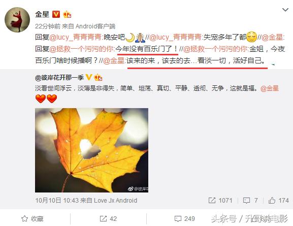 金星在10月10日轉(zhuǎn)發(fā)一條心靈雞湯:淡看世間浮云,淡薄是非得失,簡單、坦蕩、真切、平靜、透徹、無爭,這就是福。金星嘆息說:該來的來,該去的去,看淡一切,活好自己。一位粉絲詢問說:金姐,今夜百樂門啥時候播啊?金星答復:今年沒有百樂門了!《今夜百樂門》和《金星秀》結(jié)局一樣。