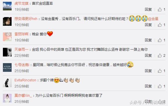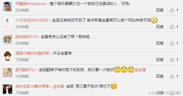 觀眾表示遺憾和無奈,全部力挺金星老師,他們留言:整個娛樂圈要打壓一個做自己說真話的人,可悲;金姐沒有電視節(jié)目了,有點希望金星秀可以做個網(wǎng)站來做節(jié)目;金星秀怎么沒有了啊?期待呢;金姐翻牌子啥時候才輪到我,我只要一次就好;喜歡金姐的真實,喜歡金星秀里的犀利言論,金姐加油;沒有金星秀,沒有百樂門,請問我還有什么好期待的呢。