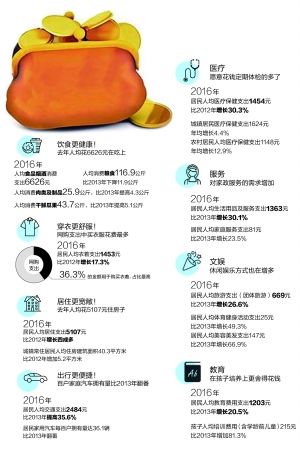 錢包鼓起來了,江蘇老百姓在吃穿住用行等方面也更舍得花錢。2016年江蘇居民人均生活消費支出22130元,比2012年增長34.8%,年均名義增長7.8%。這些錢都花在哪兒了呢?