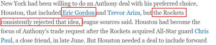 今夏,火箭為了得到安東尼,和紐約一直在談判。