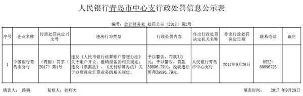 人民銀行青島市中心支行根據(jù)相關(guān)規(guī)定,對該行的違規(guī)行為分別作出予以警告,罰款3萬元;予以警告,罰款39896.79元,沒收違法所得39896.79元的行政處罰決定。作出處罰決定的日期是2017年9月26日。
