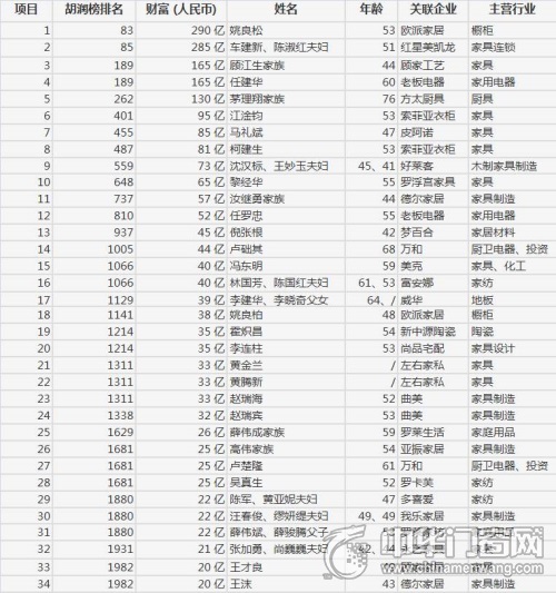 以下為胡潤(rùn)百富榜泛家居圈榜單: