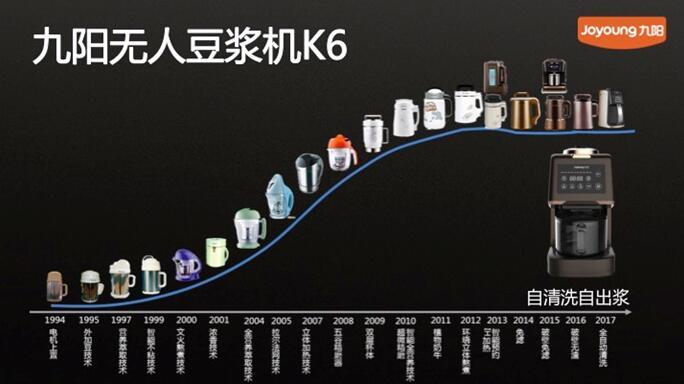伴隨著九陽首臺無人豆?jié){機(jī)K6問世,豆?jié){機(jī)從此實(shí)現(xiàn)智能操控,減掉人工手動(dòng)操作的過程,進(jìn)入了無人時(shí)代。截至2017年9月,九陽豆?jié){機(jī)已經(jīng)進(jìn)行15次技術(shù)革新,專利達(dá)1000項(xiàng),從一開始的打磨技術(shù)到加熱熬煮、精磨萃取,再到破壁免慮、智能控制,如今已實(shí)現(xiàn)無人自清洗、自出漿。