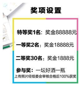 此外,大賽設(shè)置現(xiàn)金獎勵機制,獎項設(shè)置分為特等獎1名,一等獎2名,二等獎30名,其中特等獎將獨享88888元現(xiàn)金;一等獎可獲18888元現(xiàn)金;二等獎可獲1888元現(xiàn)金。另,大賽特設(shè)參與獎,只要參與比賽,均可獲得一壇好酒一瓶。高獎金設(shè)置,充分調(diào)動參賽者積極性,鼓勵大家用一壇好酒瓶體進行藝術(shù)創(chuàng)造,不僅體現(xiàn)了環(huán)保與藝術(shù)的相結(jié)合,更加激起了全民創(chuàng)作的熱情。