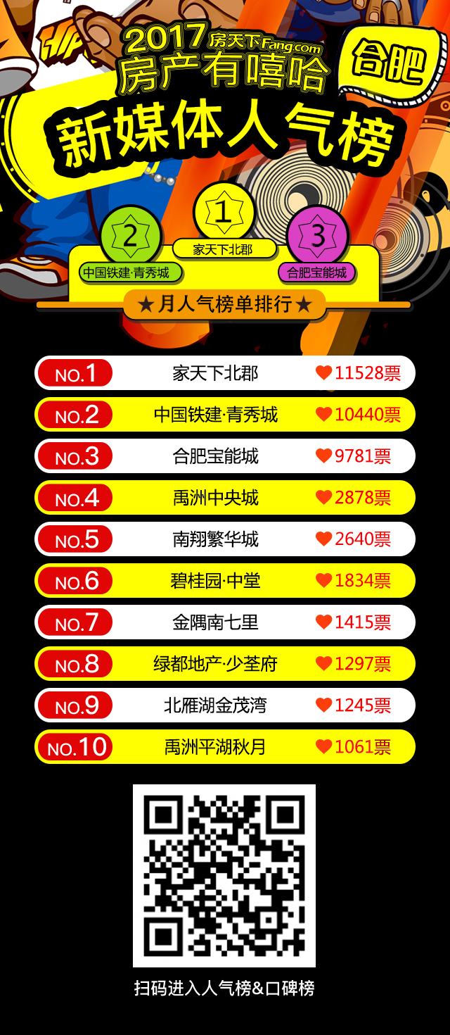 2017房產(chǎn)有嘻哈主題活動(dòng)已經(jīng)激烈的進(jìn)行了一個(gè)月,投票不斷增加,榜單不斷刷新中,合肥房天下將會(huì)每周為大家公布新榜單!這是購(gòu)房選房的一場(chǎng)盛大筵席,好時(shí)機(jī)不容錯(cuò)過!