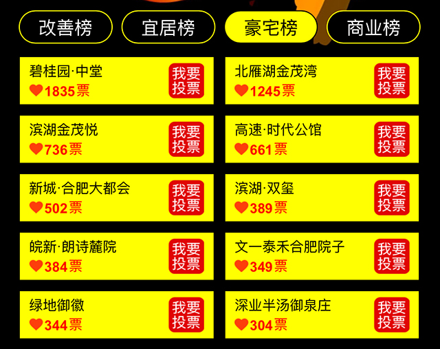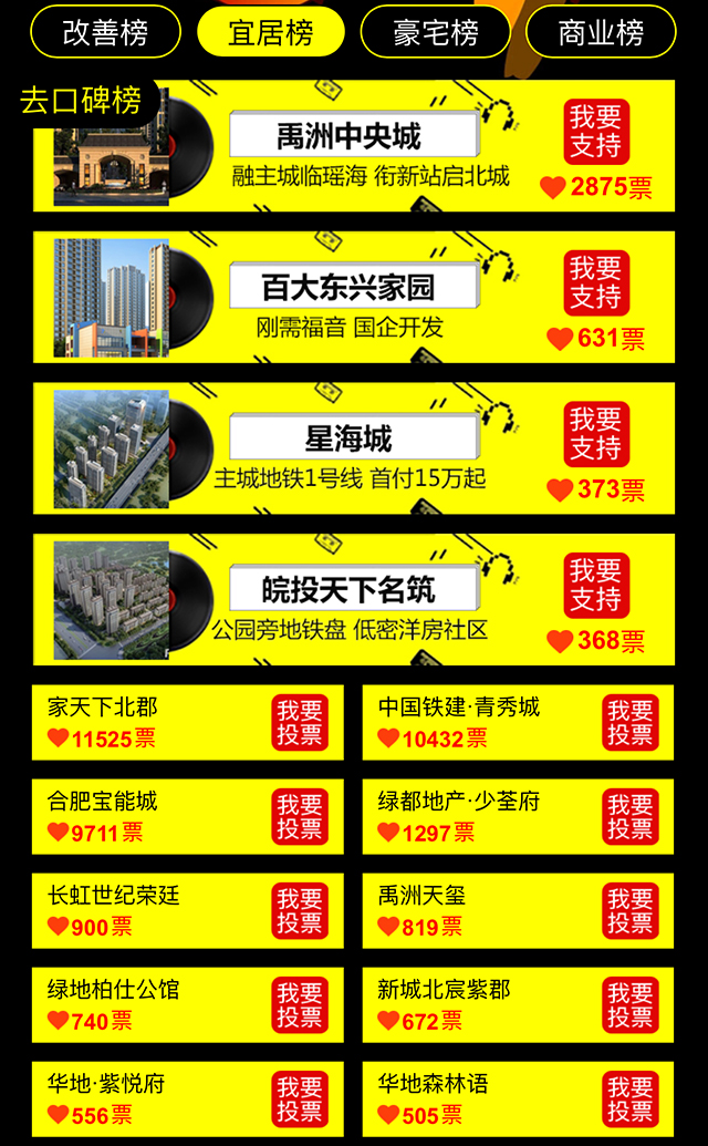 宜居榜樓盤項(xiàng)目:禹洲中央城(2880票)、百大東興家園(631票)、星海城(373票)、皖投天下名筑(368票)正在全城火熱招募樓盤代言人。