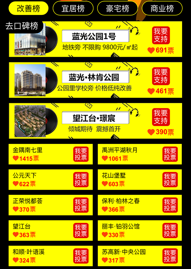 目前改善榜樓盤項(xiàng)目:藍(lán)光公園1號(hào)(691票)、藍(lán)光林肯公園(461票)以及望江臺(tái)·璟宸(390票)正在全城招募樓盤代言人。