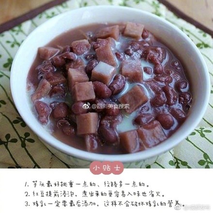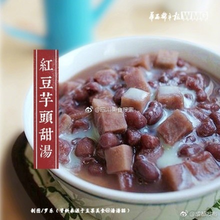 #美食成都#天氣一天天涼了下來,給自己煮點甜湯暖暖身子吧~芋頭是常見的食材,秋季吃最好,老少皆宜,健脾養(yǎng)胃,是秋季進補的一寶。ps:.紅豆要提前浸泡,這樣煮出來的更容易入味也省火;煉乳一定要最后添加,這樣不會破壞煉乳的營養(yǎng)。 via四川美食搜索
