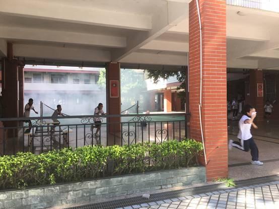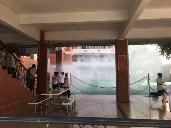 當警報鳴笛,煙霧四起時,各班班主任帶領(lǐng)全班學(xué)生進行緊急疏散,迅速撤離教室,安全有序地沿著疏散路線跑到了操場。