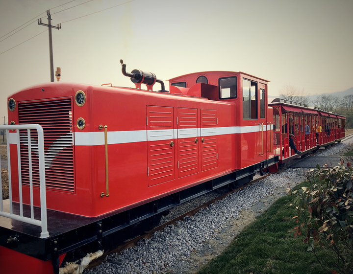 安吉魯家村朱肇聰攝 火紅的阿魯阿家號觀光小火車,在綠樹白房,山間田野里特別顯眼,仿佛迪士尼穿越到了鄉村。