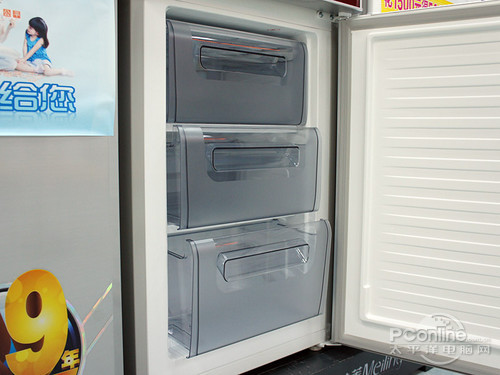 這款冰箱的冷凍能力為3.5kg/24h,作為一款單制冷循環(huán)、機(jī)械控溫的機(jī)器而言中規(guī)中矩。冷凍室為3個(gè)透明抽屜組成,較為簡(jiǎn)單。