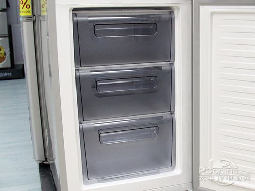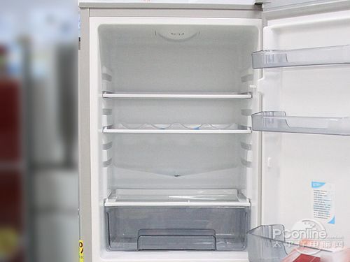 冷藏室較為簡(jiǎn)單,冷藏室內(nèi)部有兩個(gè)可調(diào)節(jié)隔板,里面的塑料部件為透明偏紫色,冷凍室采用了普通的三抽屜式,整體較為簡(jiǎn)單,不過也足夠日常使用。