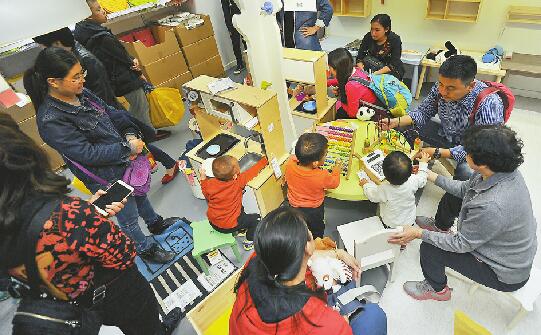 14日,家長帶著孩子在兒童用品區玩耍。記者郭堯 攝