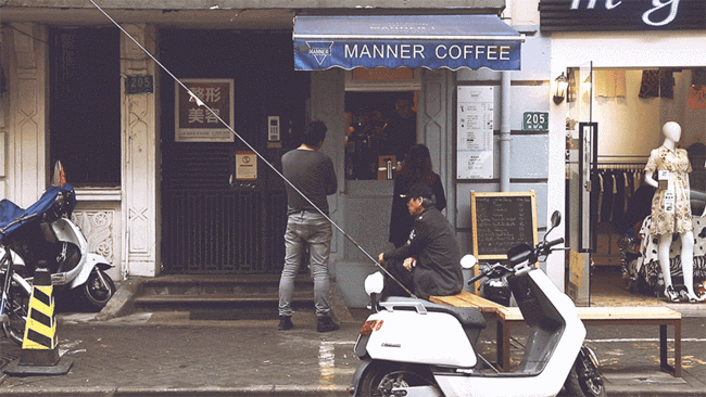這是一家只有2平方米左右的,號(hào)稱全上海最小的咖啡館。它的門面只有一個(gè)雨篷,以及一個(gè)約80厘米寬的小窗口。但這里種類齊全,不光賣常見的意式濃縮,還提供單品手沖和咖啡豆零售。這家店的名字叫做Manner Coffee。