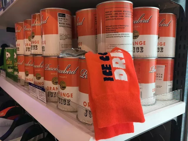 整個(gè)展臺(tái)的設(shè)計(jì)從6月份就開始策劃進(jìn)行,算得上是花了不少心思。盡管用超市的概念來推廣服裝并不算新鮮,香奈兒2014年秋冬發(fā)布的秀場(chǎng)就曾被老佛爺布置成一個(gè)超級(jí)賣場(chǎng),模特們領(lǐng)著購物籃走秀。不過在YO’HOOD現(xiàn)場(chǎng),比起其他大多數(shù)僅僅是陳列衣物的展臺(tái),這個(gè)便利店的概念至少在提供互動(dòng)上更費(fèi)心一些。
