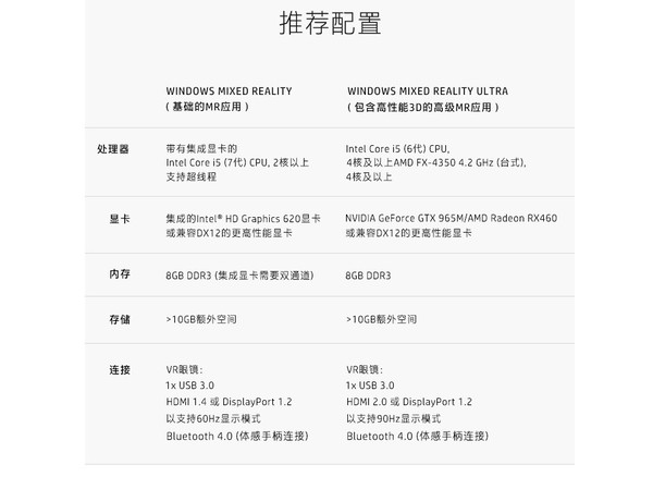 微軟在購(gòu)買頁(yè)面還介紹使用Windows MR的PC需要的配置,可以看到最低的只需要Graphics 620集成先卡就可以,但如果玩家想體驗(yàn)高水平的3D畫面的話,則需要Geforce980以上的顯卡了。另外,操作系統(tǒng)必須是Windows 10秋季創(chuàng)意者更新版本,至于頭顯本身的安裝非常簡(jiǎn)單,即插即玩。
