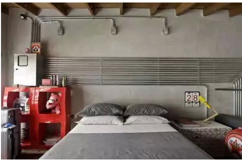 水泥墻原始、粗野,原本就是灰色,是后現(xiàn)代建筑師最愛的元素之一,一方面能營造清冷、安靜的空間,樸素不奢華;另一方面具有極大的包容性,可以多用彩色軟裝、夸張的圖案去搭配,更顯出彩。