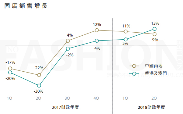 無(wú)時(shí)尚中文網(wǎng)(微信號(hào):nofashioncn)2017年10月18日:周大福珠寶集團(tuán)有限公司(1929.HK)二季度繼續(xù)反彈,期內(nèi)港澳及中國(guó)大陸同店銷(xiāo)售分別錄得13%和9%的增長(zhǎng),其中港澳市場(chǎng)明顯好于一季度的5%,而大陸市場(chǎng)增長(zhǎng)則有所放緩,亦對(duì)應(yīng)了中國(guó)消費(fèi)市場(chǎng)在三季度的走軟。