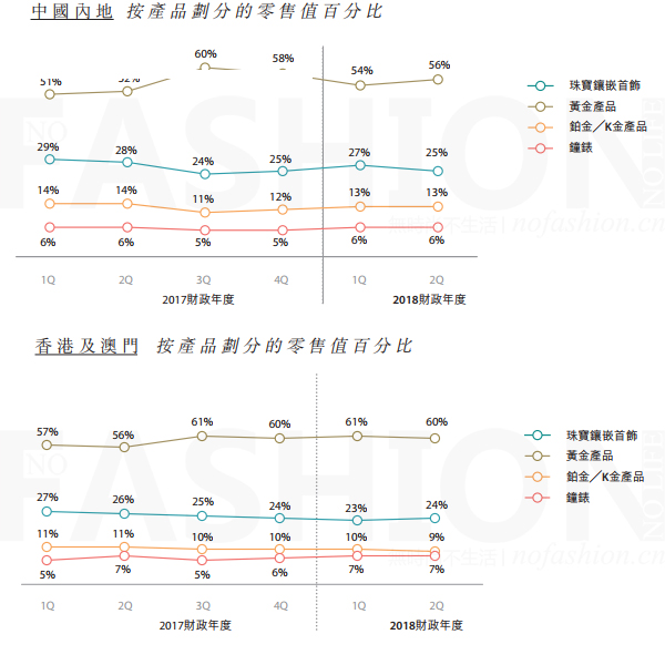 截止9月30日的二季度,周大福中國(guó)大陸市場(chǎng)珠寶鑲嵌首飾同店銷(xiāo)售跌幅1%,而港澳市場(chǎng)有7%的增幅;黃金產(chǎn)品中國(guó)大陸市場(chǎng)期內(nèi)錄得15%的增長(zhǎng),而港澳市場(chǎng)更是大漲21%。