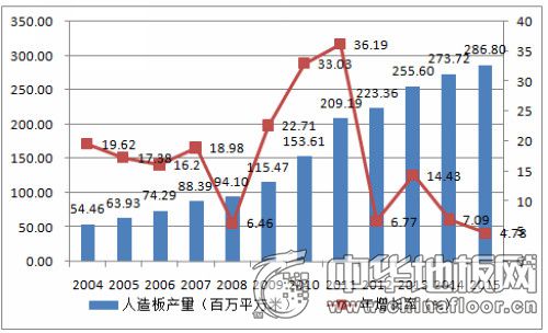 2004-2015年我國(guó)人造板產(chǎn)量及同比增長(zhǎng)率
