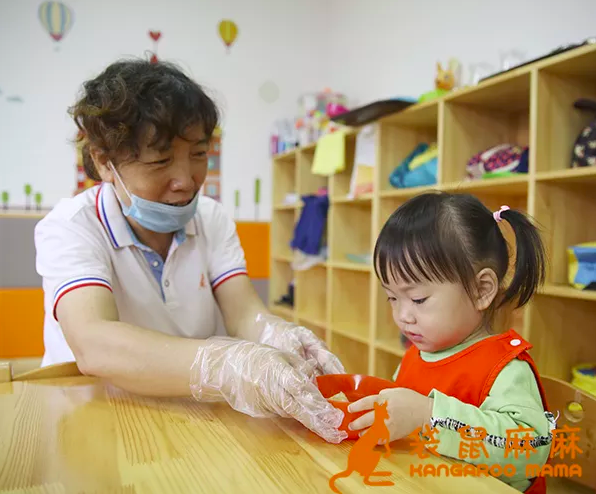 按照袋鼠麻麻標準一日流程,毛毛阿姨已經(jīng)按袋鼠寶寶的出勤人數(shù)準備好了當季果點,彎腰將果點送到每個寶寶面前。