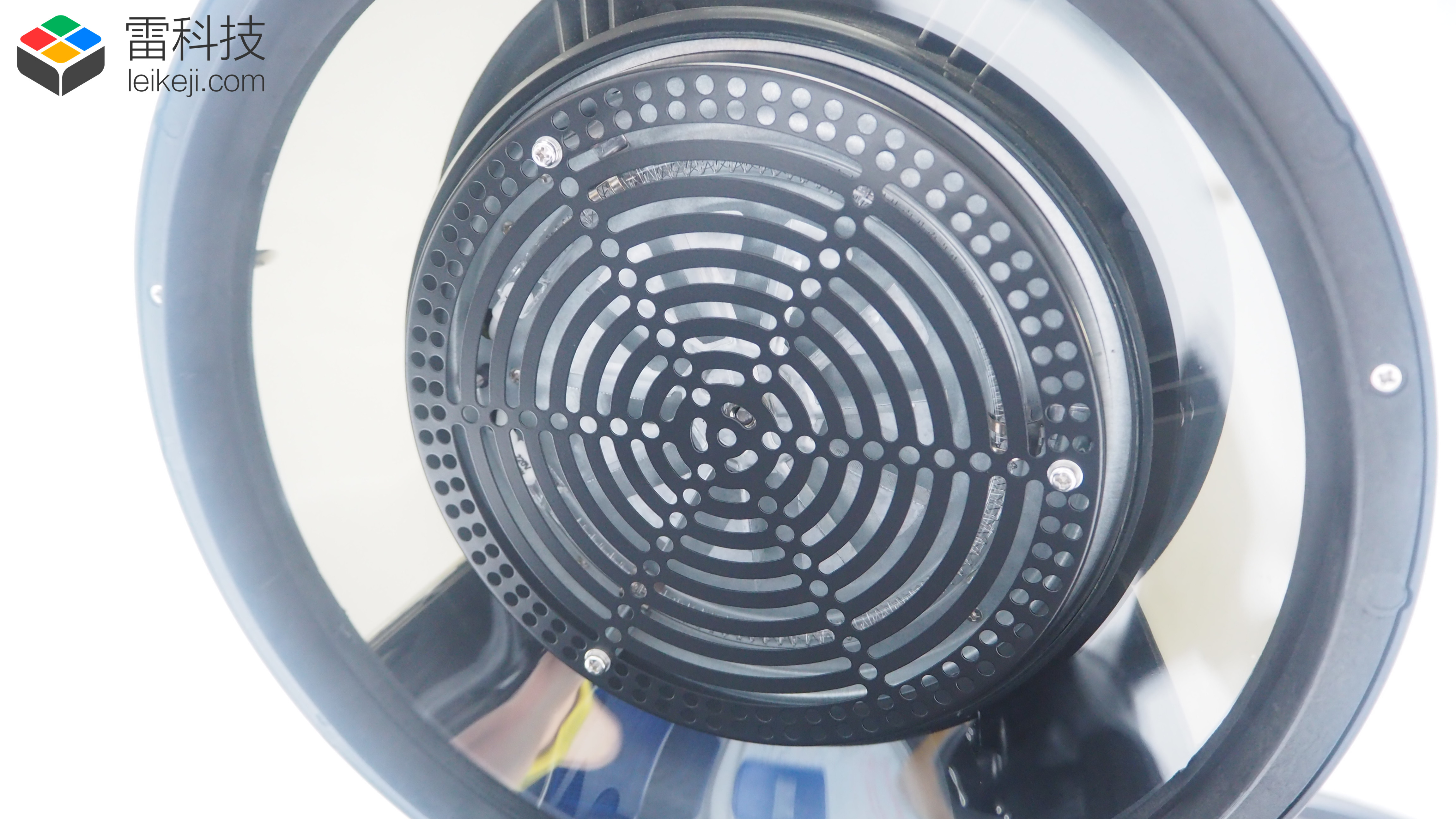 打開(kāi)這款空氣炸鍋,可以看到蓋子中配備了一個(gè)大風(fēng)扇,運(yùn)行時(shí)將熱量抽取,最后從散熱孔排出。