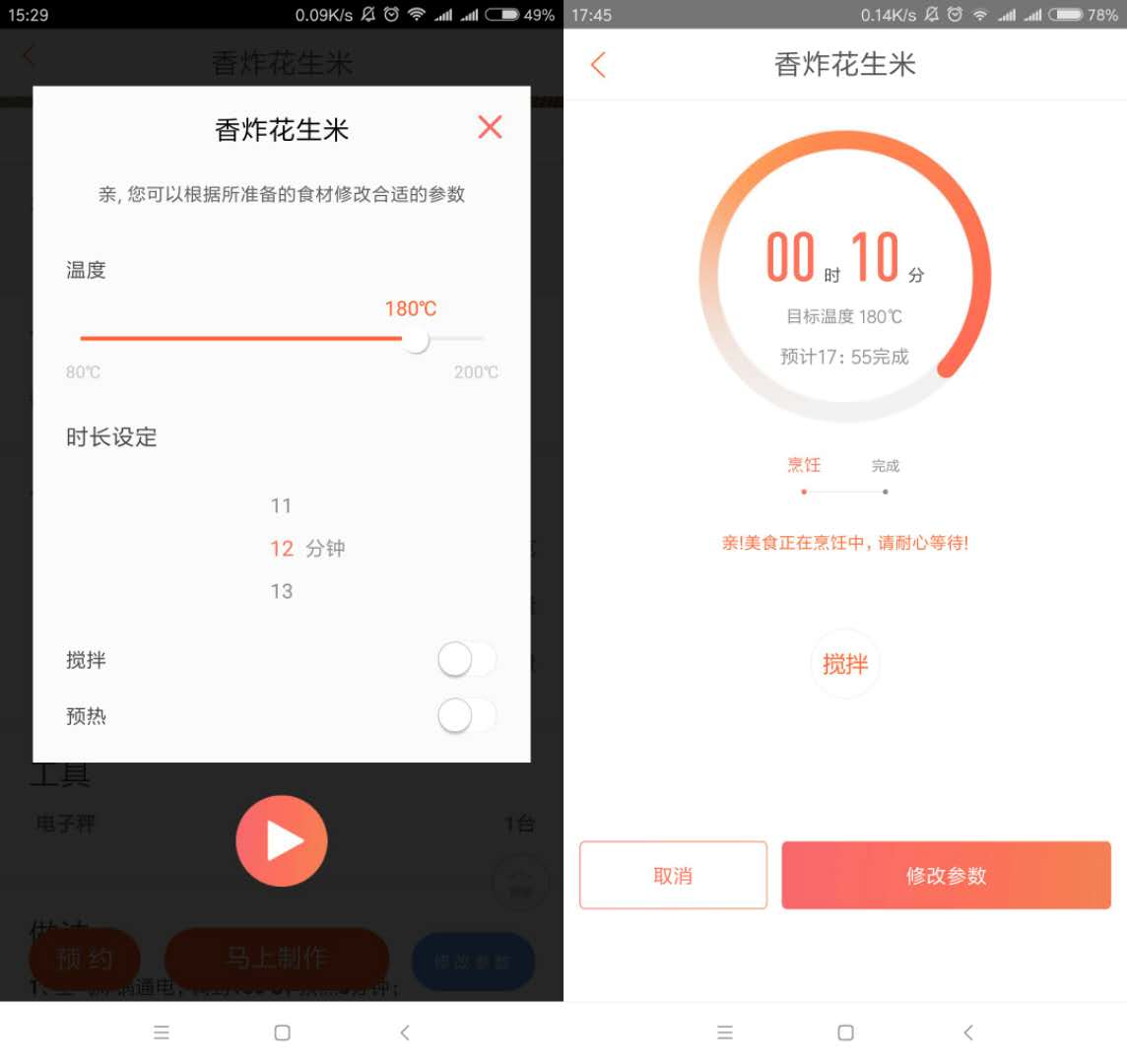 和直接在產(chǎn)品上操作相比,在APP中操作多了一項(xiàng)云菜譜功能。除了觸控板上的薯?xiàng)l、雞翅等分類(lèi),用戶(hù)自己琢磨出來(lái)的菜譜也可以分享到APP中,其他用戶(hù)可以查看使用,同時(shí)也可以根據(jù)實(shí)際情況對(duì)烹飪溫度和時(shí)間做出調(diào)整。