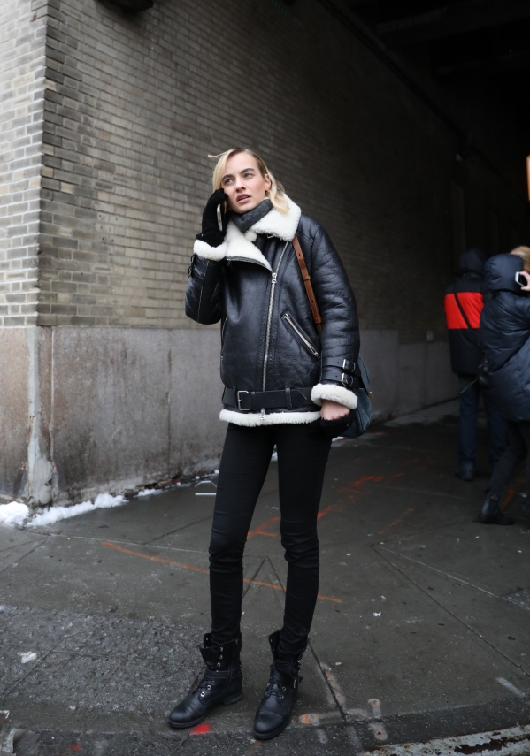 皮毛一體的帥氣機(jī)車是近年來冬天最流行的外套,保暖還顯瘦,誰說冬天就臃腫呢?搭配一條黑色絲襪,為全身造型注入些許小性感,上寬下窄的廓形給你打造完美身材。