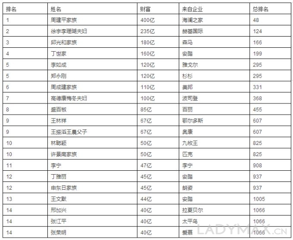 另有業(yè)界人士表示,“胡潤百富榜”忽略了國內(nèi)服飾零售領(lǐng)域一些“潛力富豪”,例如正在申請IPO的女裝DAZZLE母公司地素時尚老板馬瑞敏,以及深圳瑪絲菲爾時裝股份有限公司老板朱崇惲,后者以13億美元在2016年福布斯全球富豪榜排名第1367位,也是國內(nèi)時尚產(chǎn)業(yè)進入這個榜單的唯一女性。