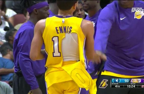 10月19日消息,在騎士和凱爾特人昨天的揭幕戰中,騎士球星勒布朗-詹姆斯的球衣被杰倫-布朗扯破,這已經是季前賽至今第二起耐克球衣撕裂事故。在季前賽中,湖人球員恩尼斯的球衣就曾經被撕裂過。