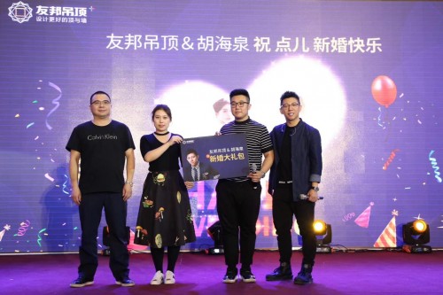 在當(dāng)天的活動(dòng)現(xiàn)場(chǎng),還有一位非常特別的粉絲,他從一個(gè)青澀的少年到如今即將步入婚姻的殿堂,15年來(lái)一直喜歡著海泉,是不折不扣的鐵粉。當(dāng)他在友邦專賣店選購(gòu)吊頂之時(shí),得知自己的偶像要來(lái)的消息,便決定親赴沈陽(yáng)為偶像加油。于是在友邦的幫助下,他在現(xiàn)場(chǎng)和未婚妻子一起收獲了海泉的祝福,并且還得到了由友邦集成吊頂總經(jīng)理王吳良親自送上的新婚大禮包。