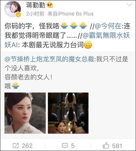 PS:今何在是《九州·海上牧云記》原著作者,蔣勤勤在劇里飾演的是大端皇帝牧云勤的皇后。連今何在都覺得牧云勤眼睛瞎了……