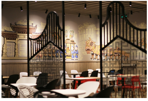 還記得小時候的生活嗎?走進(jìn)肯德基廣府文化主題餐廳,迎面看到的就是這幅3米多高的大型手繪墻:利用廣州傳統(tǒng)建筑畫面結(jié)合廣府人文和非遺元素來體現(xiàn),一步一景的畫面里都是廣州人記憶中最熟悉的生活場景。作為廣州最熱鬧的“年味”載體,廣府廟會民俗文化巡游場景也躍然墻上——“廣府巡游圖”沿著墻壁曲折展開的手繪長卷讓每個顧客都能感受到廣州新年的熱鬧與吉祥喜慶。餐廳正中蜿蜒的鑊耳屋與象征吉利永長的中式回文創(chuàng)意結(jié)合而成隔斷屏風(fēng),恰是相互輝映的一柔一剛,雖隔斷了空間但成就了經(jīng)典。